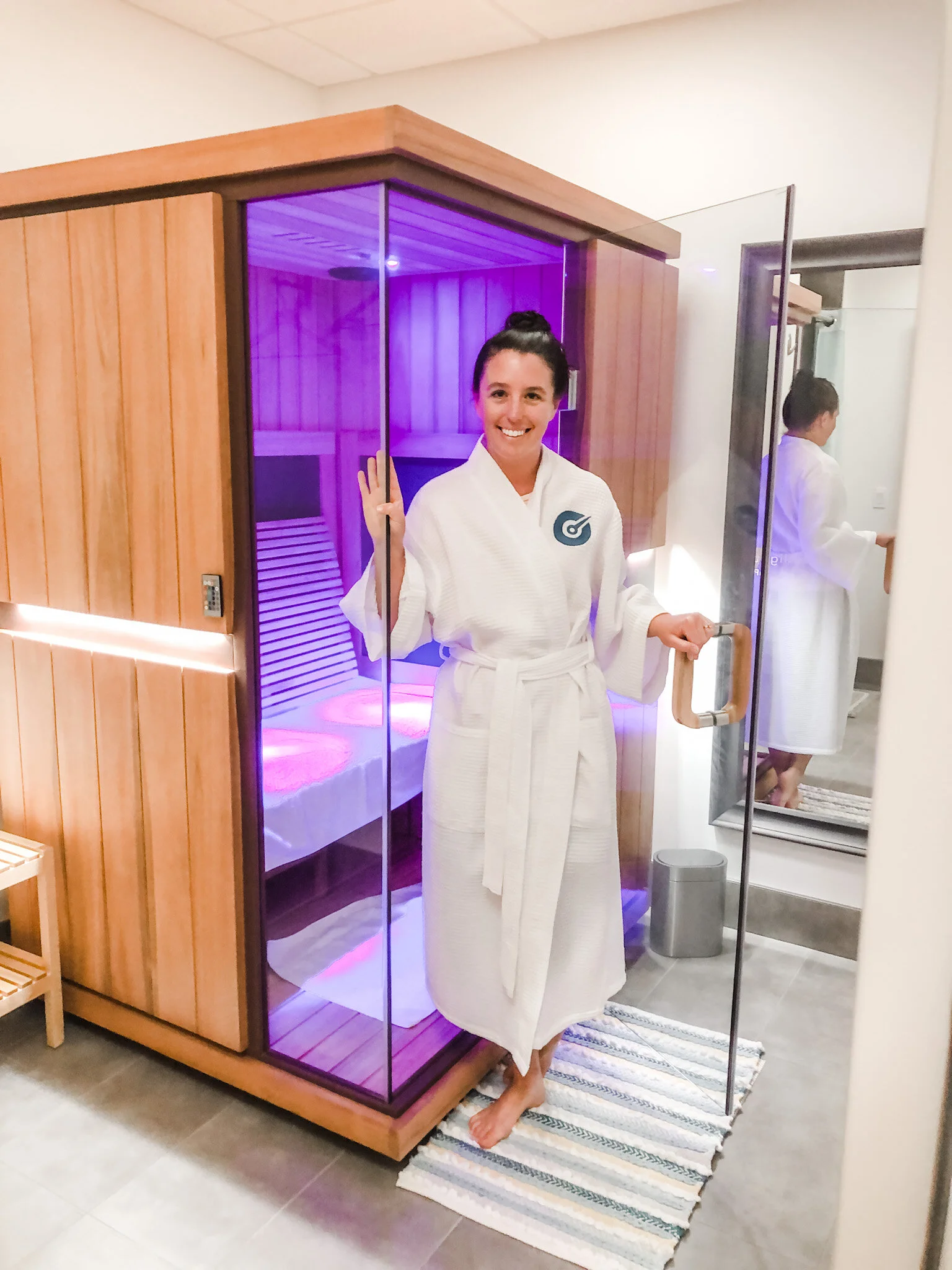 For our visit, we scheduled Compression Therapy, Photobiomodulation Therapy, an Infrared Sauna Session, and a whole-body Cryotherapy Session (Matt opted for localized)! I began with Photobiomodulation Therapy (PBM) which “uses near infrared light to reduce pain, inflammation and edema, and boost recovery. I opted to stand for my 12-minute session with PBM panel in front and back of me. Prior to starting my session, Katie (Assistant Manager), gave me a quick rundown of what was going to take place, the benefits of PBM, and that I could sit or stand and undress however much I felt comfortable (you’re in a private, locked room). I opted to stand for my twelve-minute session and completely undress for maximum benefit. The PBM panels emit heat that will start a little sweat depending on how close you pull the panels to you, but it was never uncomfortable and there is also a fan that you can turn on should you get too hot.
